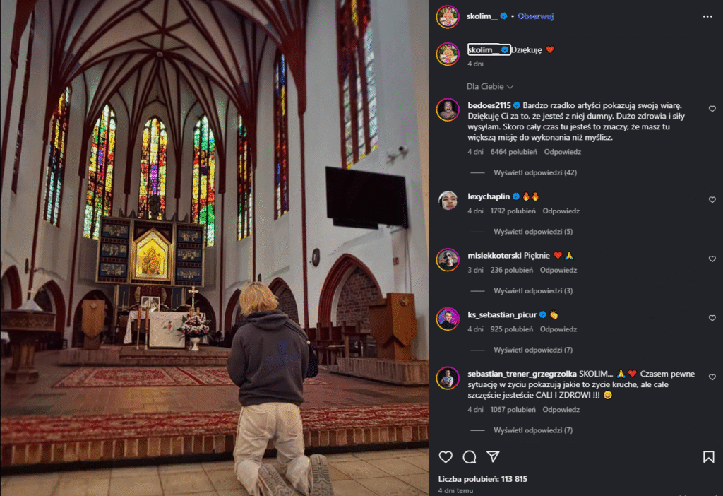 Warto przypomnieć, że Skolim już od dłuższego czasu podkreślał swoją wiarę – zarówno w wywiadach, jak i w niektórych publikacjach w mediach społecznościowych. Choć w jego wizerunku scenicznym dominuje luz i imprezowy styl, niejednokrotnie wspominał o tym, że modlitwa i Bóg są obecni w jego życiu. Jednak dla wielu jego fanów mogło to pozostać niezauważone, bo temat ten nie był wyeksponowany tak mocno jak jego muzyka czy barwne życie prywatne. Dzisiejsze gesty artysty zyskują więc dodatkowy kontekst – pokazując, że jego „dziękuję” to nie chwilowy impuls, ale coś znacznie głębszego.