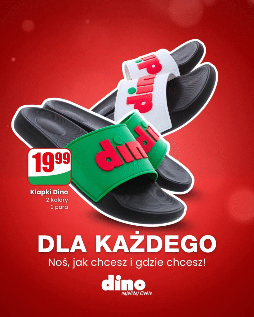 Dino wpisuje się w ten trend, ale robi to po swojemu – z odrobiną humoru i bezpretensjonalności. Slogan „Dla każdego. Noś, jak chcesz i gdzie chcesz!” idealnie oddaje lekki, wakacyjny charakter produktu. Klapki są praktyczne, ale jednocześnie stanowią element zabawy wizerunkiem marki. W czasach, gdy konsumenci chętnie manifestują swoje poczucie humoru i dystans poprzez modowe wybory, takie akcje działają jak magnes.