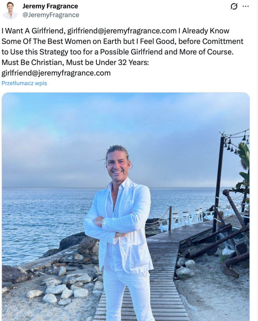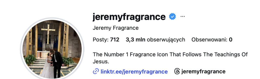 Jeremy Fragrance, urodzony jako Daniel Średziński, to postać, której kariera w social mediach jest równie olśniewająca co burzliwa.Mężczyzna stał się globalną ikoną w niszy perfumeryjnej, jednak na skutek dziwnych zachowań z poważanego eksperta stał się internetowym pariasem. W końcu przeżył jednak nawrócenie i stał się gorliwym chrześcijaninem. Parę miesięcy temu ogłosił nawet, że szuka żony – koniecznie młodej chrześcijanki. I wszystko wskazuje na to, że ją znalazł.