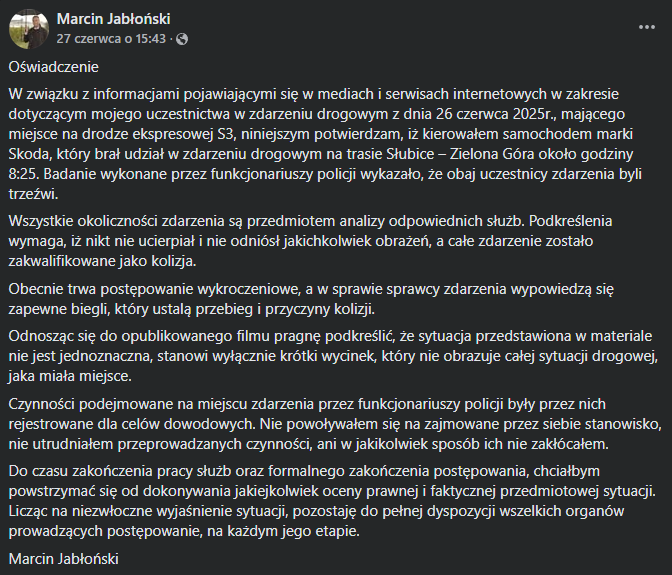 O tym przekonamy się w piątek. Ale jedno jest pewne – cała sytuacja pokazuje, jak bardzo niektórzy politycy są oderwani od rzeczywistości. Wypadek, brak skruchy, publiczne milczenie, a potem rezygnacja pod presją. Jabłoński miał szansę zachować się z klasą. Zmarnował ją.