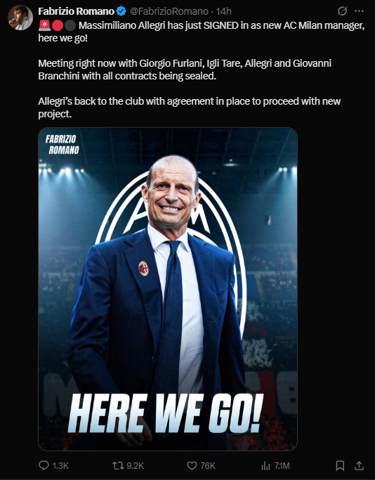 To już oficjalne – Massimiliano Allegri ponownie obejmuje stanowisko trenera AC Milan. Po intensywnych rozmowach i finalizacji kontraktu, włoski szkoleniowiec podpisał umowę i rozpoczyna nowy rozdział w swojej karierze.