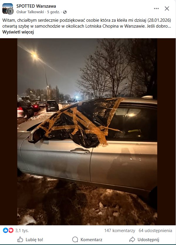 Autor posta, opublikowanego na popularnej grupie „SPOTTED Warszawa”, poinformował, że 28 stycznia 2026 roku ktoś zauważył otwartą (prawdopodobnie uszkodzoną) szybę w jego samochodzie. Zamiast zignorować problem lub wykorzystać sytuację, nieznana osoba postanowiła pomóc. Szyba została starannie zaklejona folią i taśmą, chroniąc wnętrze auta przed śniegiem, mrozem i ewentualną kradzieżą.
