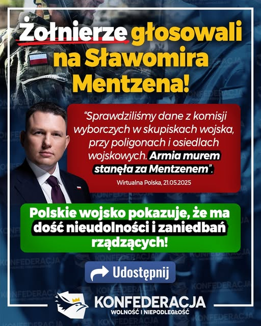 Tak silne poparcie dla Mentzena ze strony środowisk wojskowych może świadczyć o narastającym rozczarowaniu polityką bezpieczeństwa prowadzoną przez kolejne rządy. Żołnierze, którzy często zmagają się z niedoinwestowaniem, biurokracją i chaotycznymi decyzjami kadrowymi, najwyraźniej postanowili wyrazić swój sprzeciw przy urnach. Jak podkreślają przedstawiciele Konfederacji – to jasny sygnał, że Polskie Wojsko ma dość nieudolności i zaniedbań ze strony rządzących.